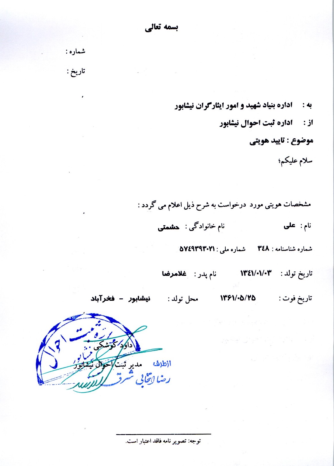 محل شهادت: استان ، شهرستان/ بخش: ، منطقه: